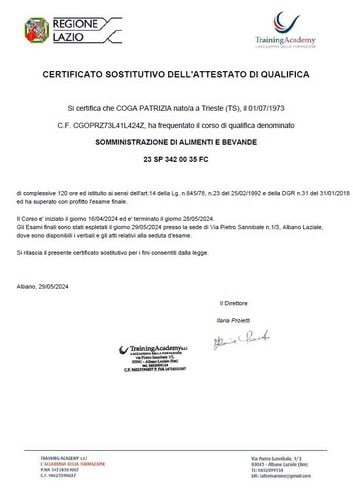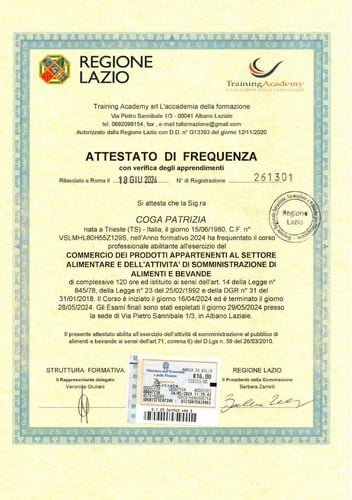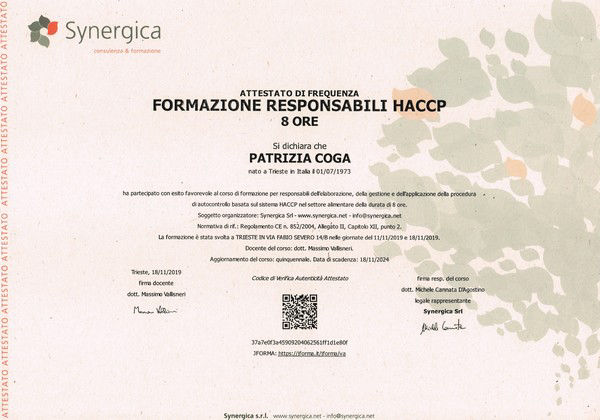 La nostra presidente PATRIZIA COGA frequenta i Corsi HACCP dal 2014 e rinnova tale competenza con i corsi di rinnovo. A giugno 2024 ha conseguito l'attestato SAB e di Responsabile dell'elaborazione, della gestione e della applicazione della procedura di autocontrollo HACCP dopo aver frequentato il corso di 120 ore e superato a pieni voti l'esame di abilitazione presso la Training Academy ad Albano Laziale (Roma).