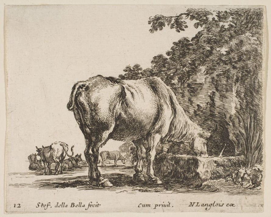 Bovino che si disseta ad un abbeveratoio in un'incisione del XVII secolo. (Fonte Wikipedia)